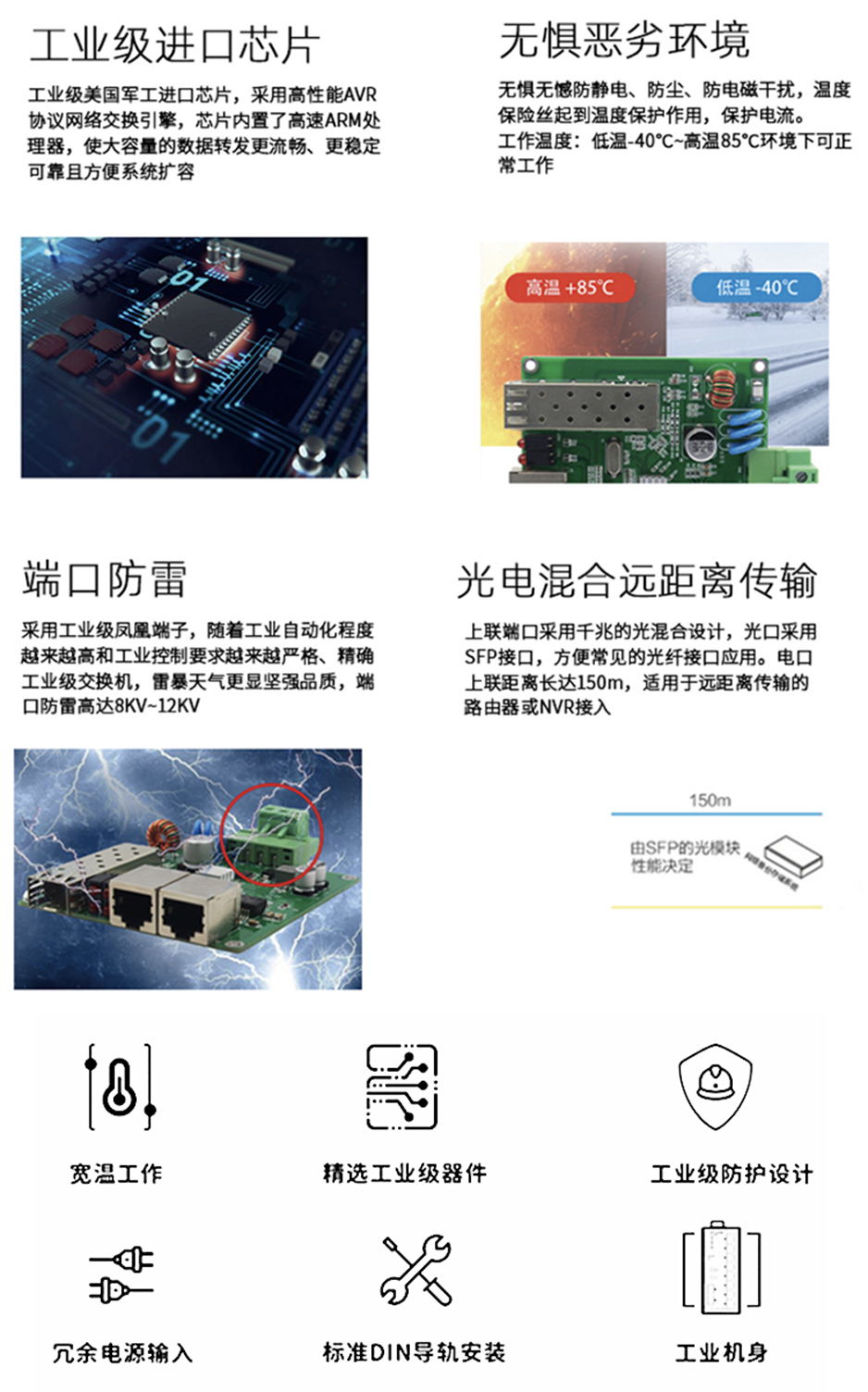 工業(yè)級(jí)POE(NT品牌)千兆網(wǎng)管4個(gè)SFP光口8個(gè)電口(8POE),導(dǎo)軌式-DC48~57V供電-寬溫(-40℃-85℃)-支持環(huán)網(wǎng)(STP/RSTP/MSTP/ERPS)-WEB/CLI管理-SNMP-VLAN。默認(rèn)不含AC電源適配器和SFP光模塊。 |