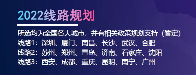 2022年第四屆交通安全萬里行以“數(shù)字賦能 智慧出行 打造交通安全新體系”為主題,分別是3-4月灣區(qū)行和7-8月份萬里行兩條線路,計(jì)劃城市:深圳、 萍鄉(xiāng) 、廣州、 成都 、杭州、 武漢、南京、濟(jì)南 、天津、 北京、 候選:珠海、東莞、惠州、佛山。