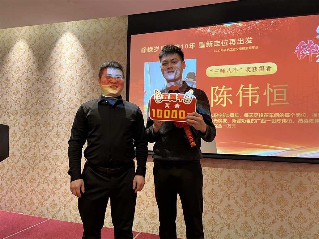 余俊云—入職宇航五周年獎,獎勵現金一萬元。手握重兵,穩如泰山,業績No.1,效率No.1,可甜可咸,人稱宇航工業交換機最佳百度百科。