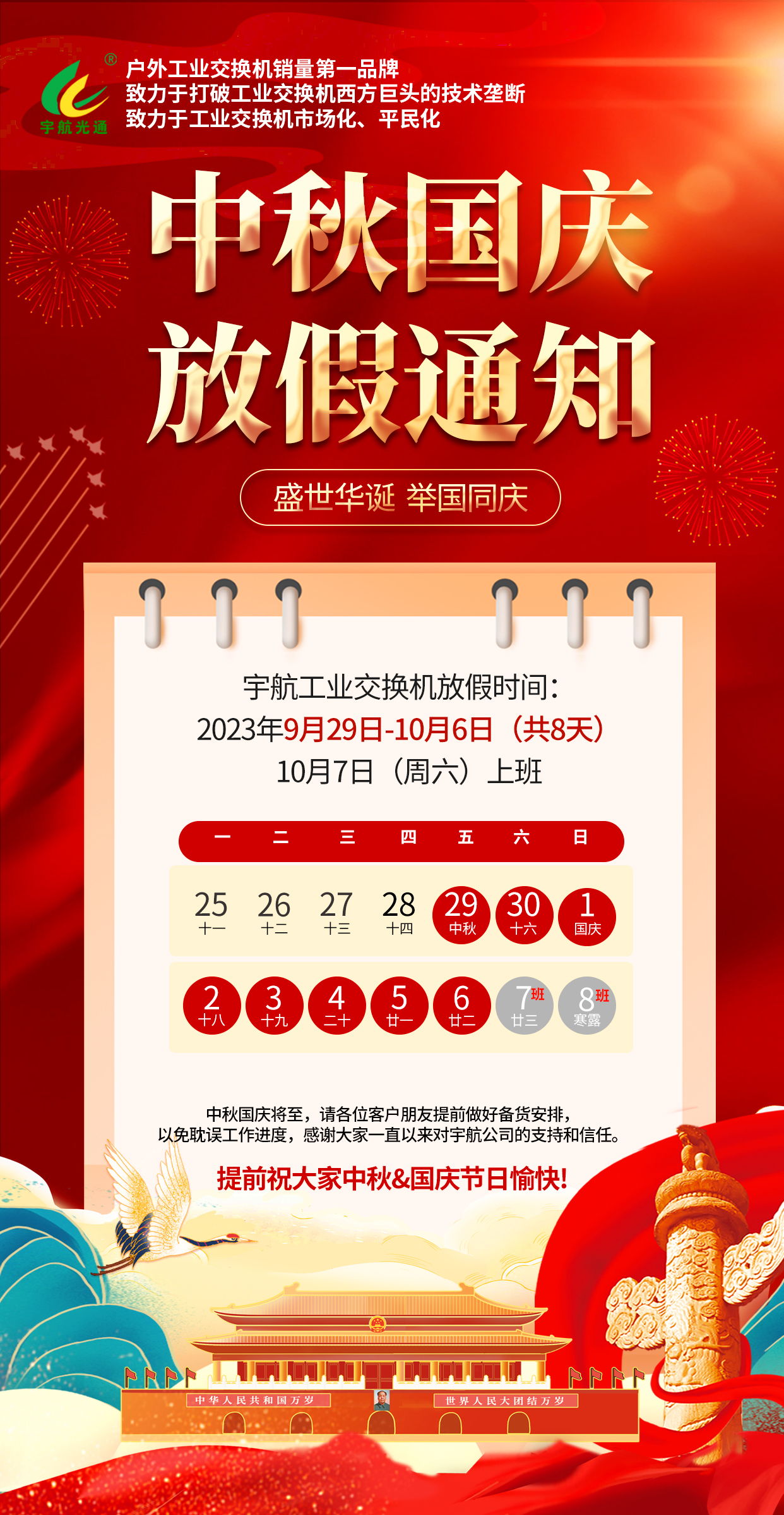 根據國家法定假期的規定,宇航工業交換機2023年中秋節、國慶節放假安排通知如下: