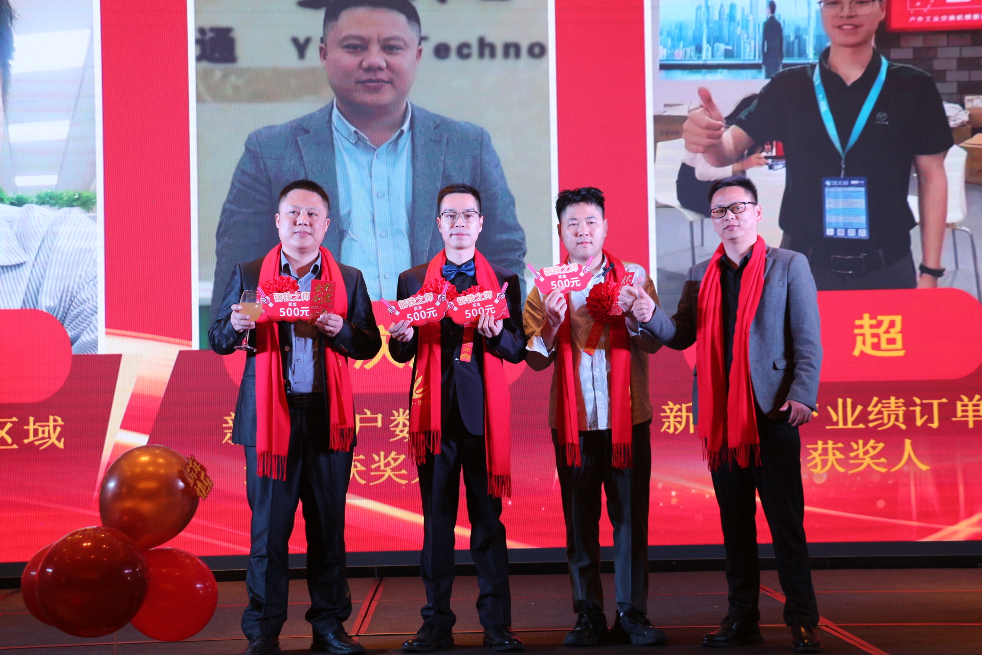 宇航工業(yè)交換機(jī)東部戰(zhàn)區(qū)銷售總監(jiān)楊慶輝抽取二等獎(jiǎng)并為獲獎(jiǎng)?wù)哳C獎(jiǎng)合影