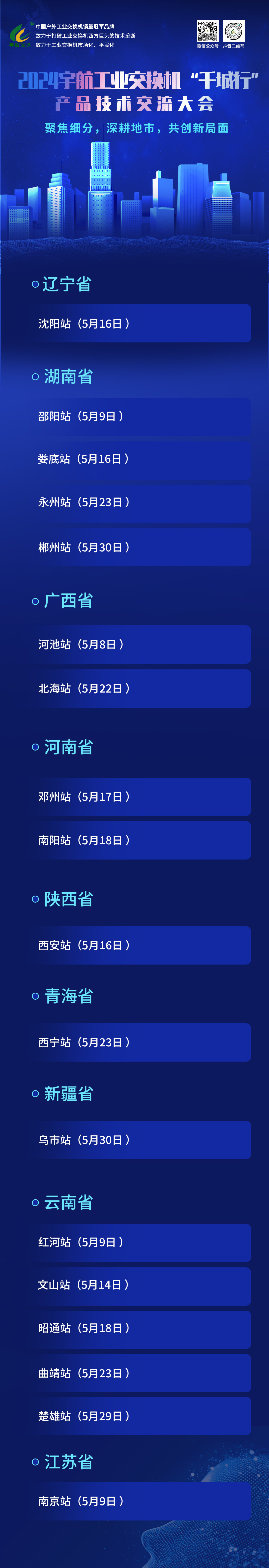 自宇航推出全國產工業(yè)交換機以來,就憑借其卓越的性能和可靠的質量,在各個行業(yè)領域取得了顯著的成績,贏得了業(yè)界的廣泛贊譽。為了與各位友商及客戶深入交流,把握市場新機遇,宇航誠摯地邀請您參加五月份在重慶、鄭州、安徽、成都、新疆、濟南等地的工業(yè)交換機相關的展會,以及在江蘇、湖南、廣西、云南、河南、陜西、青海、新疆、遼寧等城市舉辦的2024宇航工業(yè)交換機千城行產品技術交流大會。