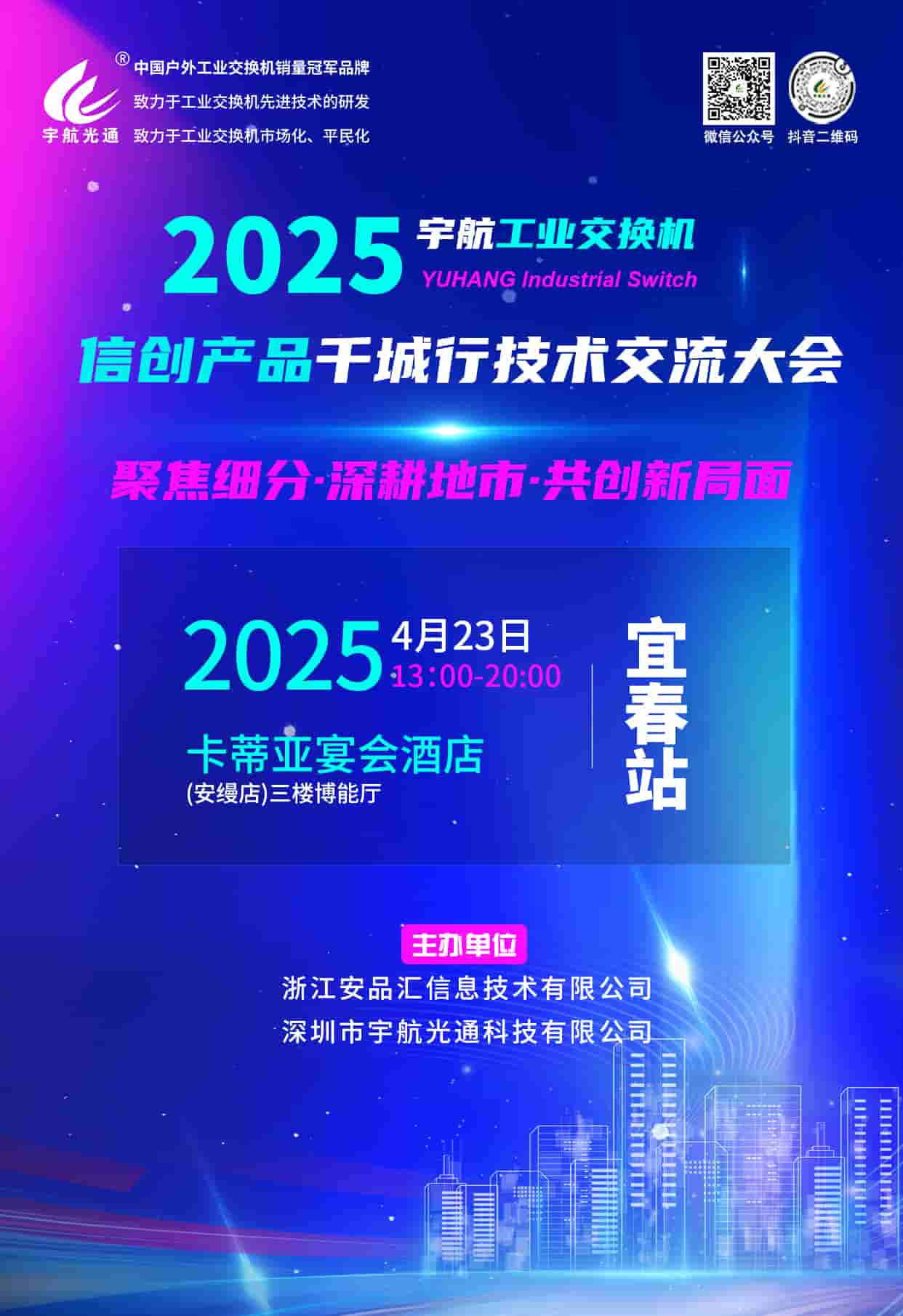 2025年4月15日至4月18日,宇航工業(yè)交換機(jī)作為中國戶外工業(yè)交換機(jī)銷量冠軍品牌,成功舉辦了2025信創(chuàng)產(chǎn)品千城行技術(shù)交流大會(huì)杭州站、南通站及贛州站活動(dòng)。三地會(huì)議匯聚行業(yè)精英,深入探討信創(chuàng)產(chǎn)業(yè)發(fā)展與工業(yè)互聯(lián)新趨勢(shì),展示了宇航在國產(chǎn)化替代領(lǐng)域的創(chuàng)新成果與技術(shù)優(yōu)勢(shì)。與會(huì)嘉賓普遍反饋收獲頗豐,此次交流盛會(huì)不僅促進(jìn)了區(qū)域產(chǎn)業(yè)協(xié)同,更為宇航品牌的全國化布局注入新動(dòng)力,彰顯了民族品牌的創(chuàng)新活力與使命擔(dān)當(dāng)。