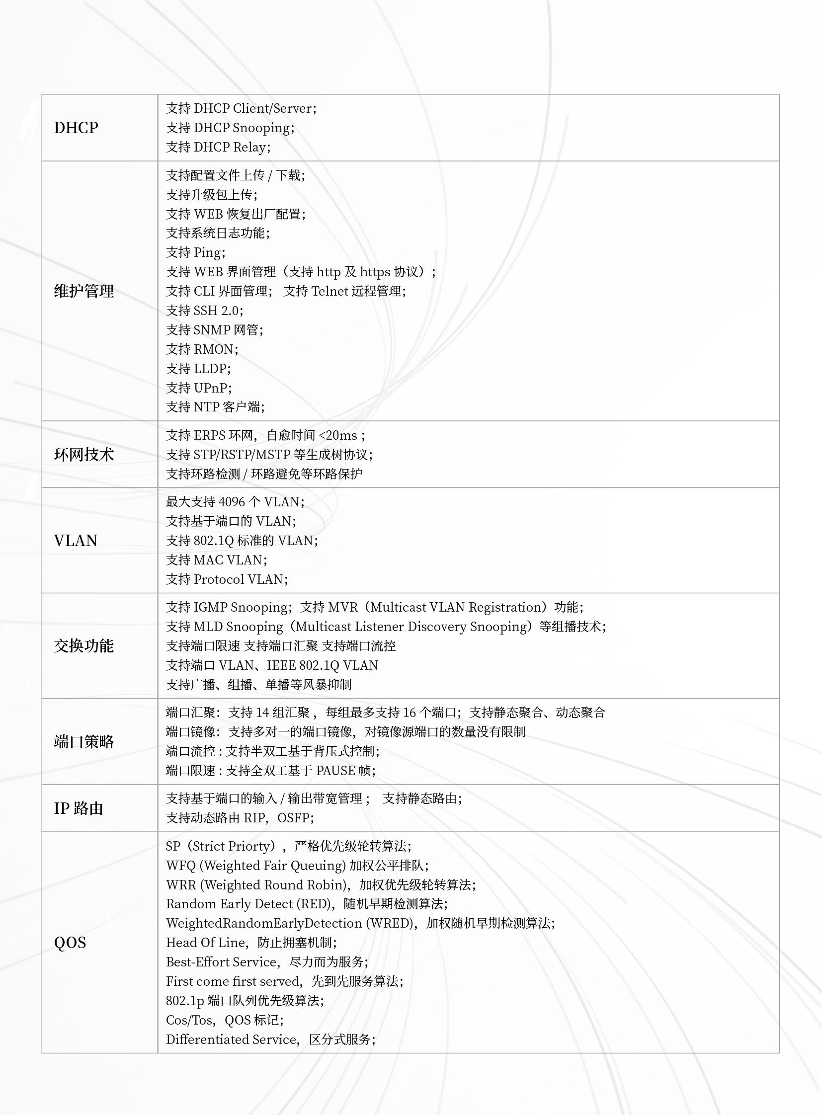 具有L2/L3/L4線速交換能力、具備QoS、帶寬控制、組播等高級功能,是定位于網絡核心層、實現整體網絡增值的優選設備。同時,提供基于硬件的流量分類和組播、速率限制和QoS機制,為用戶開展增值業務提供強大的支持。