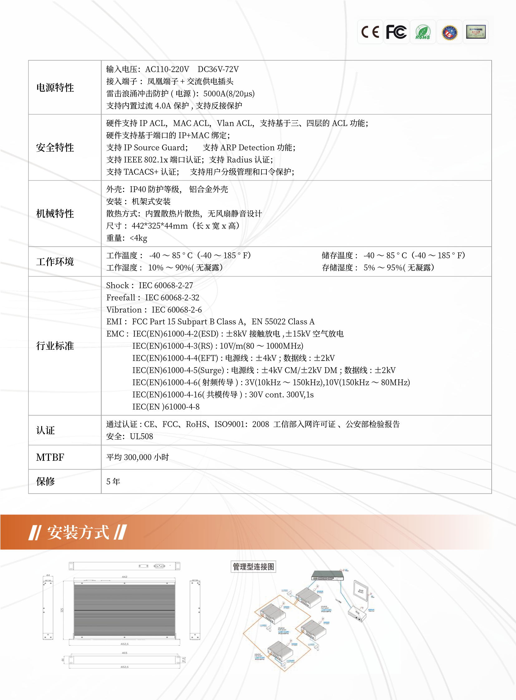 電信級雙電源冗余保護、三級防雷設計,符合國際IEC61000-4-5標準;符合安規EN60950、IEC60950標準,適應各種復雜安裝環境及惡劣天氣。