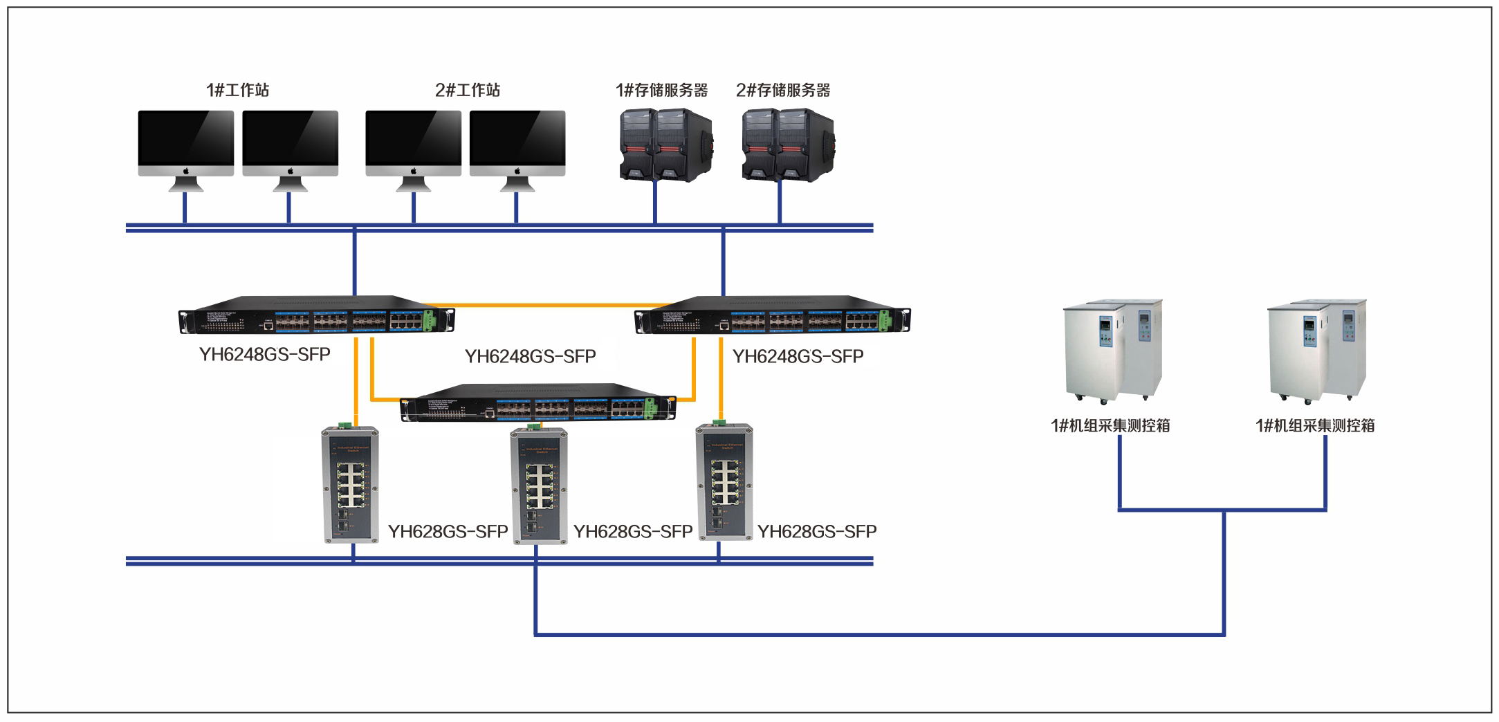 宇航在發電站集散監控系統解決方案中采用了YH6248GS-SFP,YH628GS-SFP.現場數據接入層,通過一個接口轉換服務器在DCS的I/O層上,可將現場數據信息映射成DCS的I/O總線上的數據信息,使DCS控制統一集成。數據通信層采用主控制系統1#2機組成的冗余環網信息,上行通過宇航千兆工業以太網交換機連接工作站,工程師站以及服務器等,下行通過千兆以太網交換機YH628GS連接控制管理主機站等,實現整個系統的冗余結構,包裝數據傳輸的可靠性,穩定性。